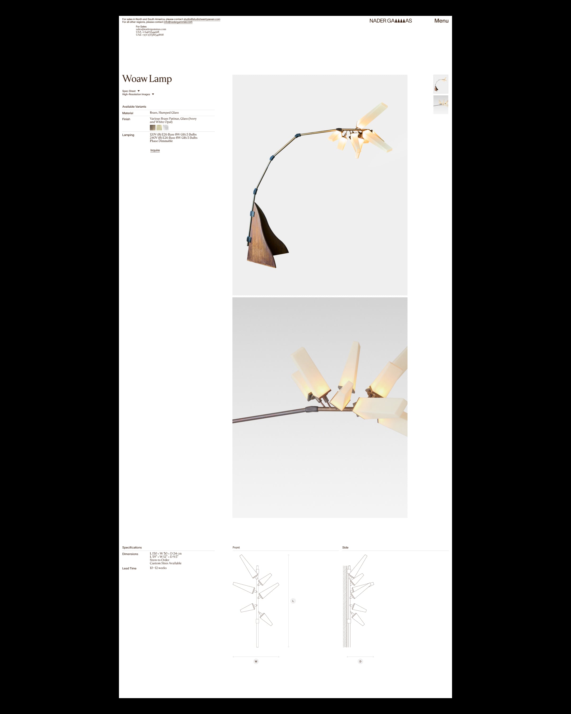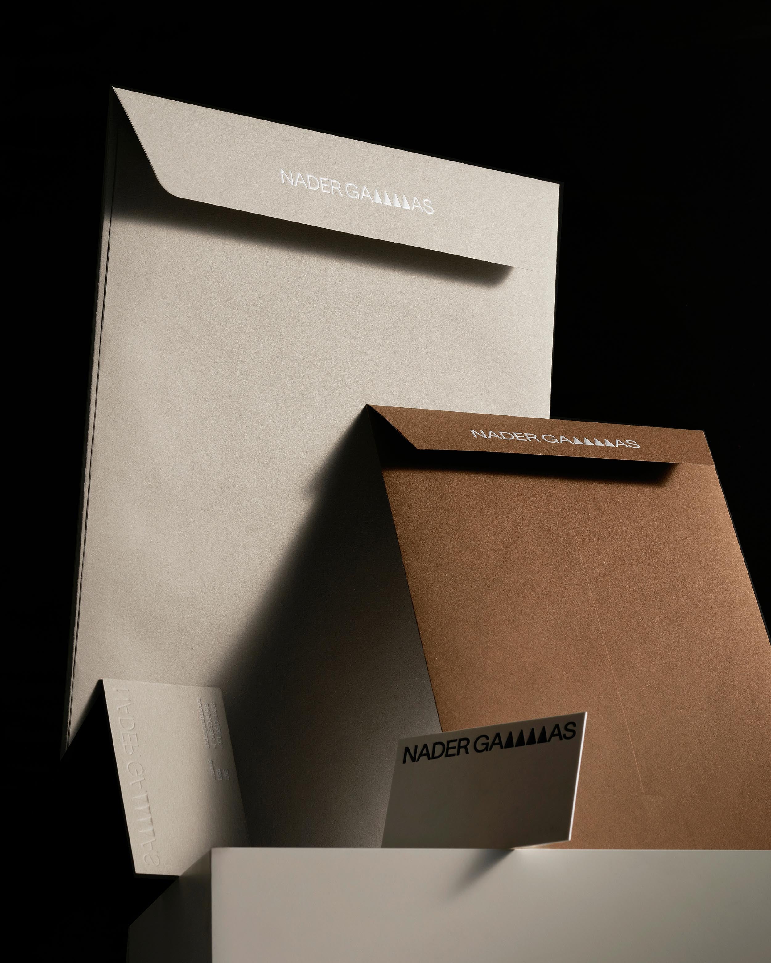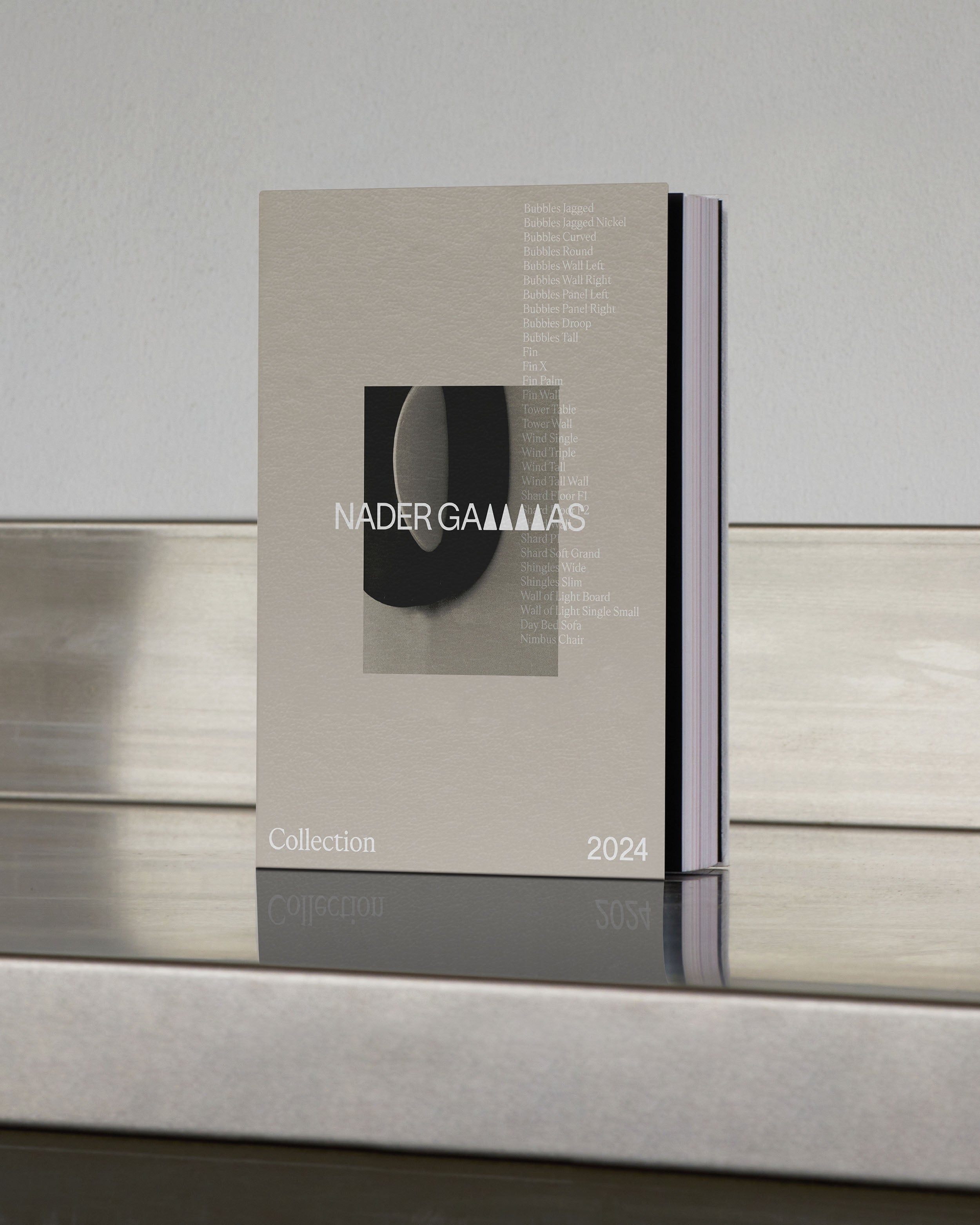 At the centre of this transformation is a custom logotype, crafted to symbolise light itself. Inspired by the interplay of beams of light, our design features a double 'M' motif, subtly reflecting the energy behind Nader Gammas' creations. The accompanying typography palette pairs the spiky serif 'Ghost' and curvy sans-serif 'Lausanne', typographic choices that reflect the forms and materials inherent in every Nader Gammas piece. Further enhancing the tactile experience, we created a suite of luxurious print materials, including price lists, swatches and stationery items. Utilising print finishes such as foil blocking and embossing on premium paper stocks, each element speaks to Nader Gammas' commitment to quality.